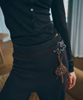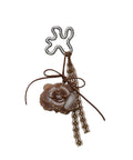 Designet tager udgangspunkt i IGENs ikoniske Swirl Hook med karabinhage, som her møder Maanestens drømmende univers gennem blonder og en varm brun blomst beklædt med rhinsten. Samlet i en sløjfe bindes de to universer sammen.